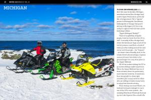 TO NON-SNOWMOBILERS who don ’ t live near its borders , Michigan sometimes seems like a foreign land , and its Upper Peninsula in particular like a foreign planet . Tell a “ regular ” person in Minneapolis , Des Moines , Indianapolis or Chicago that you ’ re driving to Michigan ’ s U . P . for a trip , and you might as well tell them you ’ re trailering to Mars . “ Upper Michigan ? Really ?!” Those of us gleefully irregular people , however , know that the U . P . is … well … it actually is like a foreign land , where the forests are huge , much of the territory seems unsettled , a chunk of history is often hiding around the next corner and the people – the “ Yoopers ” – are down-home friendly . And , in the winter , there ’ s almost always a copious amount of snow that sticks to the ground longer than any other place in the Upper Midwest .