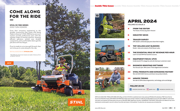 OPE PLUS ( ISSN 0192-7558 ) ( USPS 0006-257 ) ( Reg . U . S . Pat . & T . M . Off .) is published seven times yearly by EPG Brand Acceleration , 7760 France Avenue South , Suite 810 , Bloomington , MN 55435 . POSTMASTER : Please send change of address to OPE Plus , P . O . Box 96 , Port Jervis , NY 12771-0096 . For subscription information and requests , call Subscription Services at ( 763 ) 383-4492 . Registration Number : R125906743 . © COPYRIGHT 2024 , OPE PLUS . Material may not be reproduced or photocopied in any form without the written permission of the publisher . To subscribe visit www . ope-plus . com / subscribe .