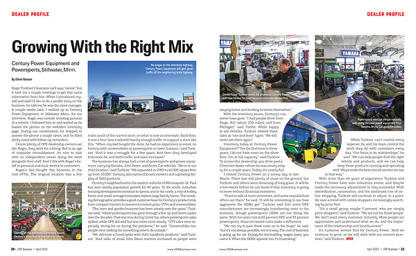 Roger Tuckner ’ s business card says “ owner ,” but it took me a couple meetings to get that same information from him . When I introduced myself and said I ’ d like to do a profile story on the business , he told me he was the store manager . A couple weeks later , I walked up to Century Power Equipment , in Stillwater , Minn ., for our interview ; Roger was outside shooting pictures of a vehicle . I followed him in and waited as he loaded the photos on his website ’ s inventory page . During our conversation , he stopped to answer the phone a couple times , and he filled sticky notes with follow-up reminders .