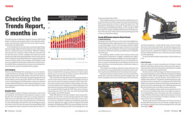 This trends report brings special attention to pricing which is crucial to sales success and to a dealer ’ s profitability . Pricing is also a trend to watch through the remainder of 2023 , with inventory issues and parts-price inflation . When looking at the yearover-year inflation of the selling prices of OPE market parts , this report shows continuous and increasing prices for the four quarters counting Q3 2021 through Q2 2022 . Those price increases , respectively , were 5.3 %, 7.9 %, 10 %, and 12.6 % ( tracking 82,000 part numbers at 2,150 OPE dealers ).