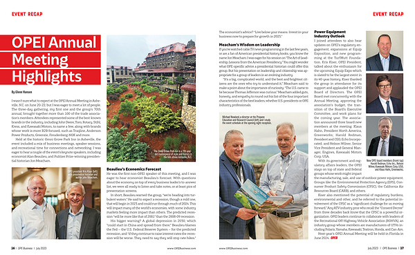 I wasn ’ t sure what to expect at the OPEI Annual Meeting in Asheville , N . C . on June 20-22 , but I was eager to meet a lot of people . The three-day gathering , my first one and the group ’ s 70th annual , brought together more than 100 of the trade association ’ s members . Attendees represented some of the best-known brands in the industry , including John Deere , Toro , Rotary , Stihl , Kress , and Kawasaki Motors , to name a few , along with brands whose work is more B2B focused , such as Traqline , Anderson Power Products , Greenzie , Freudenberg-NOK and more .
