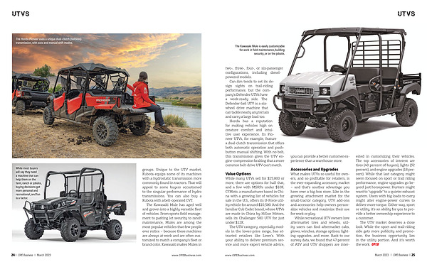 Accessories and Upgrades What makes UTVs so useful for owners , and so profitable for retailers , is the ever-expanding accessory market – and that ’ s another advantage you have over a big-box store . Like in the growing attachment market for the small-tractor category , UTV add-ons and accessories help owners personalize vehicles and maximize their use for work or play .