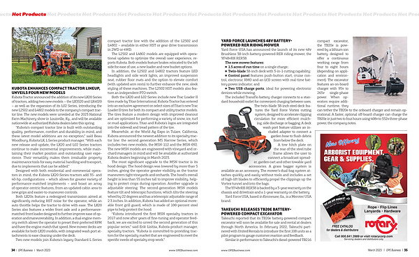 KUBOTA ENHANCES COMPACT TRACTOR LINEUP , UNVEILS FOUR NEW MODELS Kubota Tractor announced the addition of its new LX20 Series of tractors , adding two new models – the LX3520 and LX4020 – as well as the expansion of its L02 Series , introducing the new L2502 and L4802 models to the company ’ s compact tractor line . The new models were unveiled at the 2023 National Farm Machinery show in Louisville , Ky ., and will be available nationwide at authorized Kubota dealers later this spring .