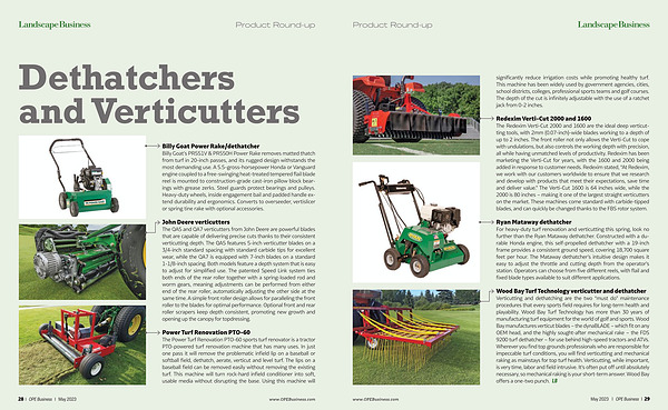 Ryan Mataway dethatcher For heavy-duty turf renovation and verticutting this spring , look no further than the Ryan Mataway dethatcher . Constructed with a durable Honda engine , this self-propelled dethatcher with a 19-inch frame provides a consistent ground speed , covering 18,700 square feet per hour . The Mataway dethatcher ’ s intuitive design makes it easy to adjust the throttle and cutting depth from the operator ’ s station . Operators can choose from five different reels , with flail and fixed blade types available to suit different applications .