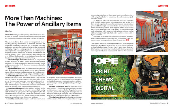 When someone thinks of an outdoor power equipment dealership , they probably envision walls of chainsaws , trimmers , and blowers and a showroom floor filled with mowers and machines of all shapes and sizes . Coming from a background in commercial landscaping , I ’ ve gained a unique perspective on what a customer is looking for when walking through the door . At our three powerequipment locations in New York , we ’ ve used this experience and customer feedback to stock items that benefit both our customers in the field and the bottom line of our business . Here ’ s why you should consider expanding your inventory variety .