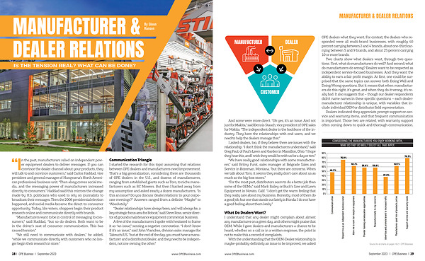 Two charts show what dealers want , through two questions . First , what do manufacturers do well ? And second , what do manufacturers do wrong ? Dealers want to be respected as independent service-focused businesses . And they want the ability to earn a fair profit margin . At first , one could be surprised that the same topics can answer both Doing Well and Doing Wrong questions . But it means that when manufacturers do this right , it ’ s great , and when they do it wrong , it ’ s really bad . It also suggests that – though our dealer respondents didn ’ t name names in these specific questions – each dealermanufacturer relationship is unique , with variables that include individual OEM or distributor field representation .