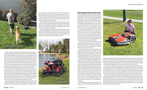 Baum saw that many buyers of robotic mowers were easily frustrated by equipment they had to( or chose to) set up themselves. Mowers were failing because they weren’ t set up properly, he said, and few dealers were enthusiastic about supporting robots.“ I think the manufacturers have kind of taken it into their own hands and said,‘ Listen, if dealers aren’ t going to get on board, we’ re going to make it easier for the customer just to pick it up and make the machine work.’” Whether it’ s correlation or causation, the rise of directto-consumer robot sales helps prove Baum right. Still, Brodner and Baum have capitalized on the current condition. This spring, the dealership sold and installed 30 robotic mowers each month.