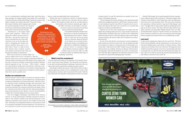 Exmark was not the only manufacturer we spoke with that talked about helping dealers become “ omni-channel ” businesses . “ Kubota dealers sell parts online , yes ,” said Don Lowe . “ Implements will be the next move for us . But we ’ re going to take our time before we get to vehicles . We want to make sure our dealers are comfortable with this .”
