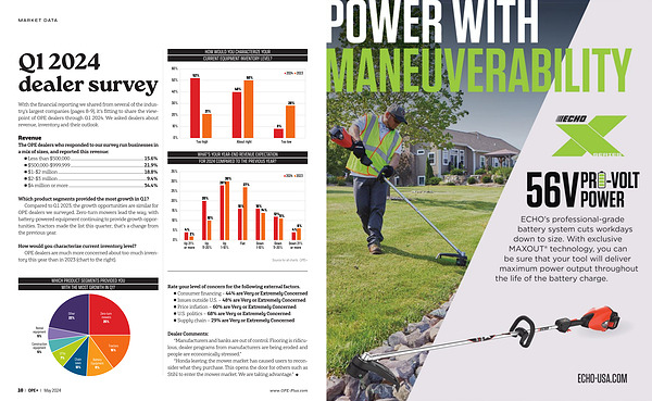 With the financial reporting we shared from several of the industry ’ s largest companies ( pages 8-9 ), it ’ s fitting to share the viewpoint of OPE dealers through Q1 2024 . We asked dealers about revenue , inventory and their outlook . |