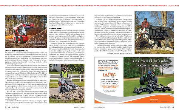 The machines themselves can go only so far . “ Attachments are key ,” said Deere ’ s Emily Pagura . “ Buckets and forks are commoditized , but attachments like mulching heads and rotary cutters , we can meet a wide variety of needs with attachments . It ’ s about more versatility .”