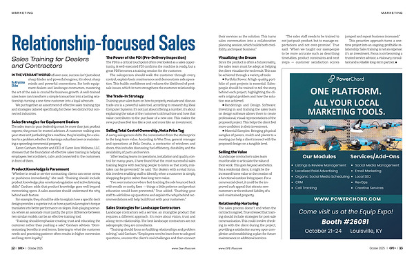 This proactive approach turns a onetime project into an ongoing, profitable relationship. Sales training is not an expense; it’ s an investment. Focus is on becoming a trusted service advisor, a visionary consultant and a reliable long-term partner. www. OPE-Plus. com October 2025 OPE + 13