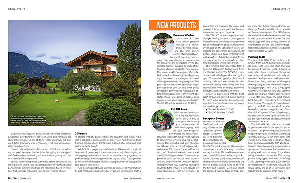 Stihl’ s new RE 140 Vario Control pressure washer is a homeowner-focused cleaning tool that allows control of all central functions with one-finger movement. Users regulate spray pressure via the smaller of the two trigger levers. The selected pressure can also be saved at the touch of a button, similar to cruise control. Plus users can add cleaning agent from the built-in tank to the water jet just by pressing a button on the spray gun. A special cleaning nozzle is no longer required. The pressure washer’ s steel-reinforced highpressure hose uses an anti-twist quick coupling to prevent hose twisting and offers generous freedom of movement. The stable chassis uses large wheels for easy maneuvering, even over uneven terrain. The RE 140 will be available in Q2 2026.