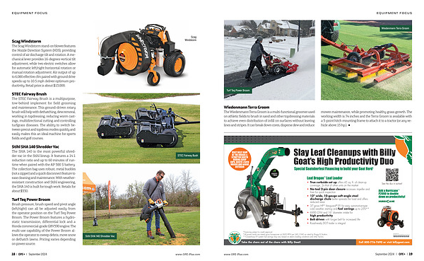 The Scag Windstorm stand-on blower features the Nozzle Direction System ( NDS ), providing control of air discharge tilt and rotation . A mechanical lever provides 16-degrees vertical tilt adjustment , while two electric switches allow for automatic left / right horizontal rotation or manual rotation adjustment . Air output of up to 6,000 effective cfm paired with ground drive speeds up to 10.5 mph deliver optimum productivity . Retail price is about $ 13,000 .