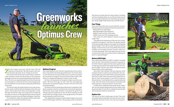 Chen and Greenworks want to prove that their commercial battery-powered equipment meets four parameters. As powerful as a gas engine As lightweight as gas equipment Able to last more than a tank of gas Able to take care of the charging solution