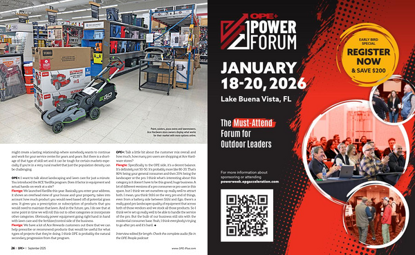 OPE +: I want to talk about landscaping and lawn care for just a minute. You introduced the ACE YardRx program. Does it factor in equipment and actual hands-on work at a site? Flentge: We launched YardRx this year. Basically you enter your address, it shows an overhead view of your house and your property, takes into account how much product you would need based off of potential grass area. It gives you a prescription or subscription of products that you would need to maintain that lawn. And in the future, yes, I do see that at some point in time we will roll this out to other categories or incorporate other categories. Obviously power equipment going right hand in hand with lawn care and the fertilizer / control side of the business. Flentge: We have a lot of Ace Rewards customers out there that we can help prescribe or recommend products that would be useful for what types of projects that they’ re doing. I think OPE is probably the natural secondary progression from that program.