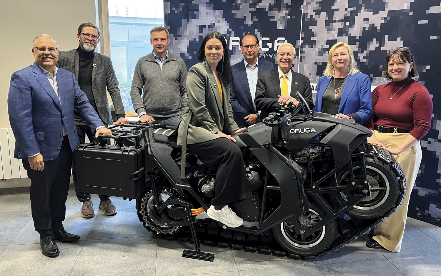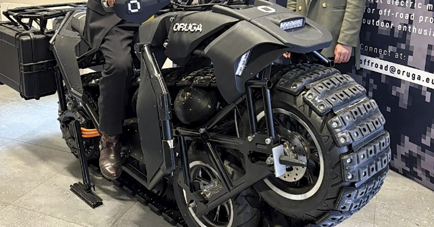 Left : The team from Oruga demonstrated the world’s first single-track electric motorcycle — a true off-road beast created in Latvia — in Toronto in April. The company is exploring market opportunities in North America and may open a manufacturing facility in Canada. (Photo: Liene Vitola) Above : The Unitrack’s proprietary technology combines a track system’s traction with a motorcycle’s steering and tilting characteristics. (Photo: Oruga)