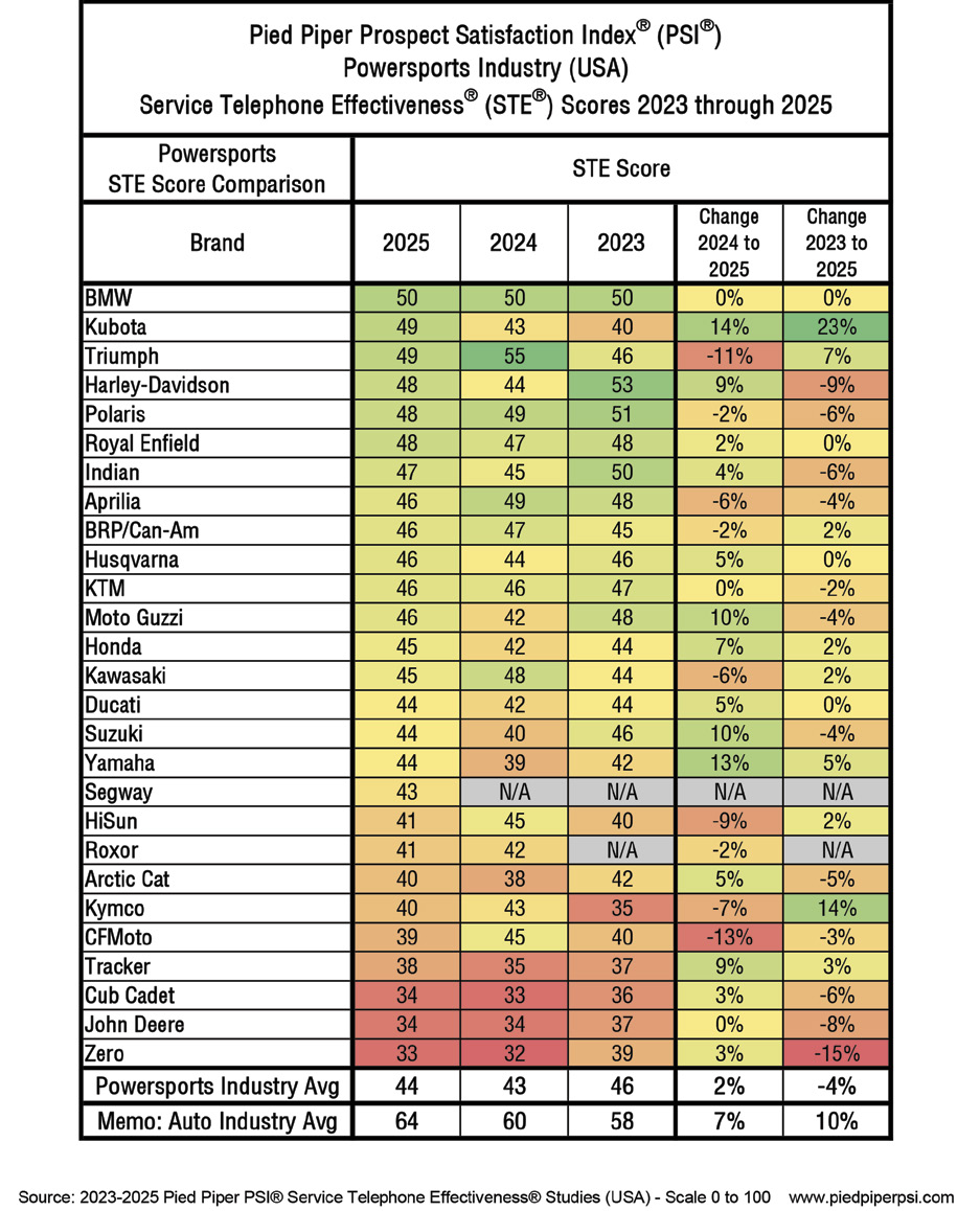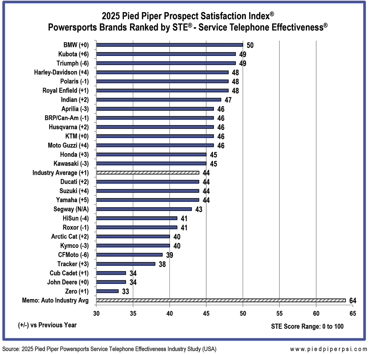 BMW Motorrad dealerships had the highest score on Pied Piper’s 2025 PSI Service Telephone Effectiveness (STE) Powersports Industry Study, which measured the efficiency and quality of customer attempts to schedule service appointments by telephone. Following BMW were Kubota, Triumph, Polaris Off-Road, and Harley-Davidson.