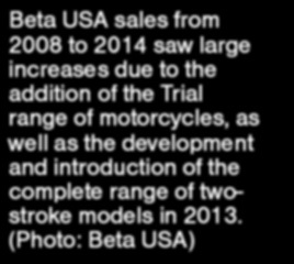 Beta USA sales from 2008 to 2014 saw large increases due to the addition of the Trial range of motorcycles, as well as the development and introduction of the complete range of twostroke models in 2013. (Photo: Beta USA)