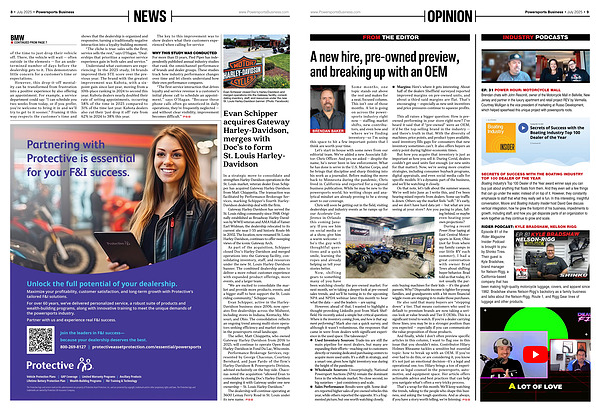And finally, while I don’ t often preview specific articles in this column, I want to flag one in this issue that you shouldn’ t miss. Contributor Hilary Holmes Rheaume tackles a sensitive but essential topic: how to break up with an OEM. If you’ ve ever had to do this, or are considering it, you know it’ s not just an emotional decision— it’ s a legal and operational one, too. Hilary brings a ton of experience as legal counsel in the powersports, automotive, and equipment space. Her article offers actionable advice and best practices that can help you navigate what’ s often a very tricky process.