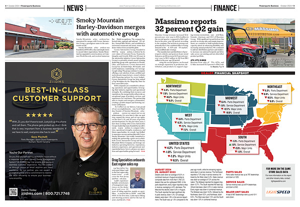 Dealers were down an average of 6.5 % in combined revenue in August according to composite data from more than 1,700 U . S . dealers that use the Lightspeed DMS . In the parts department , every region reported a drop in revenue , averaging a 4.2 % decrease . The West led this decline , down 5.6 % in August . The South reported the least signifi cant dip in parts revenue , down 1.3 %. On average , dealers were down 1.8 % in the service department . The South was up 1.0 % compared to the