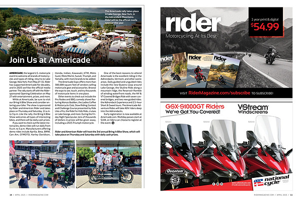 AMERICADE , the largest U . S . motorcycle event to welcome all brands of motorcycles and types of riding , returns to Lake George , New York , from May 27- 31 . Rider has supported Americade for decades , and in 2025 we ’ ll be the official media partner . The rally starts off with the Ridersponsored Opening Celebration on May 27 with entertainment , prizes , and more .