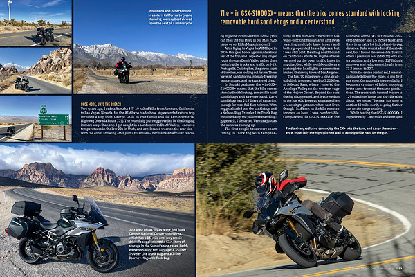 Just west of Las Vegas is the Red Rock Canyon National Conservation Area , which has a 13-mile one-way scenic drive . To supplement the 51.4 liters of storage in the Suzuki ’ s side cases , I added Nelson-Rigg soft luggage : a 35-liter Traveler Lite Trunk Bag and a 7-liter Journey Magnetic Tank Bag .