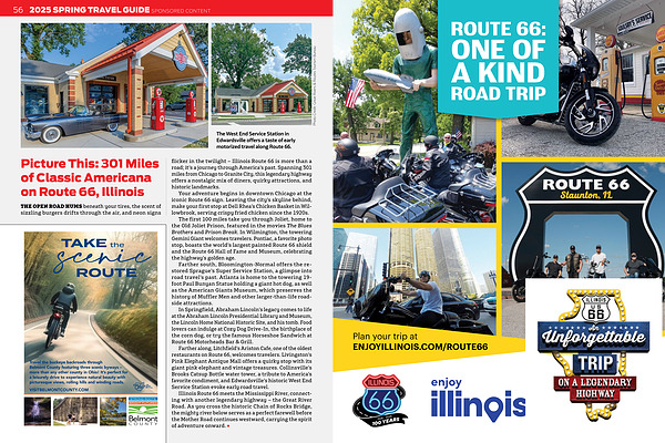 Travel the buckeye backroads through Belmont County featuring three scenic byways – more than any other county in Ohio ! It ’ s perfect for a leisurely drive to experience natural beauty with picturesque views , rolling hills and winding roads . flicker in the twilight – Illinois Route 66 is more than a road ; it ’ s a journey through America ’ s past . Spanning 301 miles from Chicago to Granite City , this legendary highway offers a nostalgic mix of diners , quirky attractions , and historic landmarks .