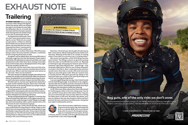 My current touring bike , a 2010 Gold Wing , has that same sticker . The Wing is almost as good for putting down the miles as the ST1100 was , but I ’ m not . My body is showing its age and paying me back for years of mistreatment . I get aches and pains that – 20 years ago – only old people talked about . Now I ’ m one of those old people , or at least I feel like it . Now I understand why someone would trailer their bike to avoid a 900-mile interstate slog to an area with great roads . After all , vacation time is usually limited . Why beat yourself up riding on the interstate when you could cut the time by driving a tow vehicle and sharing driving duties ?