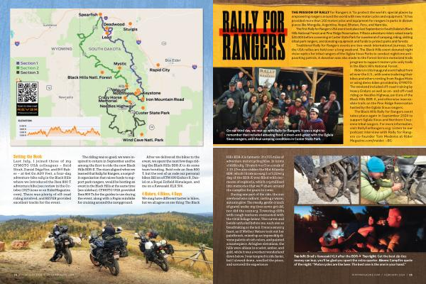 The riding was so good , we were inspired to return in September and be among the first to ride the new Black Hills BDR- X . The stars aligned when we learned that Rally for Rangers , a nonprofit organization that raises funds to support park rangers , would be hosting an event in the Black Hills at the same time ( see sidebar ). CFMOTO USA provided Ibex 800 Ts for the guides to use during the event , along with a Papio minibike for cruising around the campground .