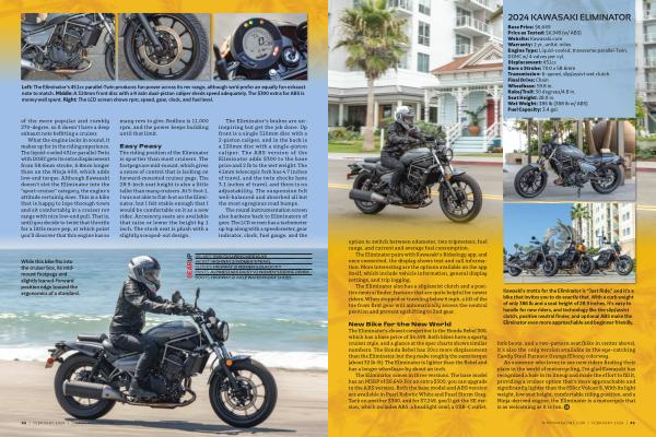 Left : The Eliminator ’ s 451cc parallel-Twin produces fun power across its rev range , although we ’ d prefer an equally fun exhaust note to match . Middle : A 310mm front disc with a Nissin dual-piston caliper sheds speed adequately . The $ 300 extra for ABS is money well spent . Right : The LCD screen shows rpm , speed , gear , clock , and fuel level .