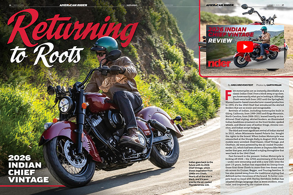 Other classic touches abound. Fender tips. Footboards. An illuminated headdress ornament. Covers on the forks and rear shocks. A vintage‑style pullback handlebar. A solo seat. Black finishes on the engine with silver‑painted pushrod tubes and cylinder heads, the latter resembling the aluminum heads used on early Chiefs. Although I would have loved to see the Chief Vintage offered in Tangerine like the 1953 Chief, color options are limited to Black Metallic and Indian Motorcycle Red.