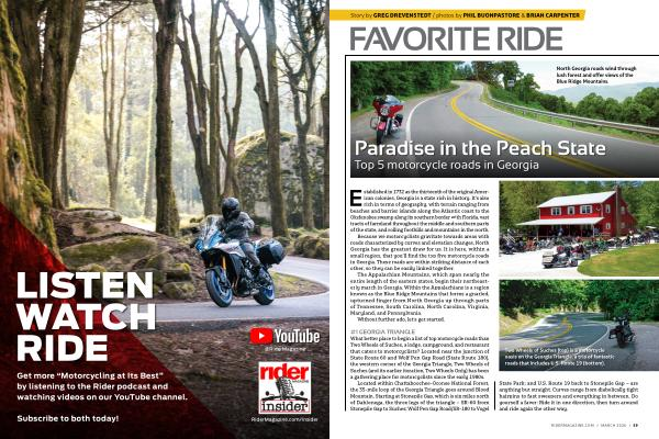 Located within Chattahoochee-Oconee National Forest, the 35-mile loop of the Georgia Triangle goes around Blood Mountain. Starting at Stonepile Gap, which is six miles north of Dahlonega, the three legs of the triangle – SR-60 from Stonepile Gap to Suches; Wolf Pen Gap Road/SR-180 to Vogel State Park; and U.S. Route 19 back to Stonepile Gap – are anything but straight. Curves range from diabolically tight hairpins to fast sweepers and everything in between. Do yourself a favor: Ride it in one direction, then turn around and ride again the other way.