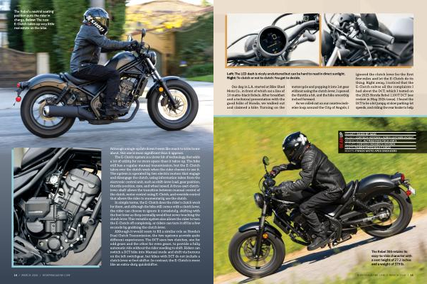 The Rebel’ s neutral seating position puts the rider in charge. Below: The new E-Clutch takes up very little real estate on the bike.