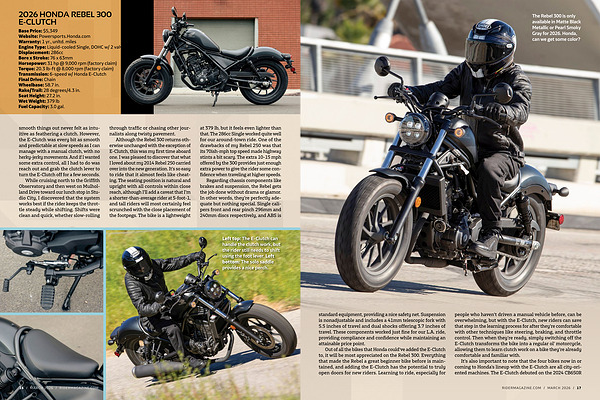 The Rebel 300 is only available in Matte Black Metallic or Pearl Smoky Gray for 2026. Honda, can we get some color? standard equipment, providing a nice safety net. Suspension is nonadjustable and includes a 41mm telescopic fork with 5.5 inches of travel and dual shocks offering 3.7 inches of travel. These components worked just fine for our L. A. ride, providing compliance and confidence while maintaining an attainable price point.