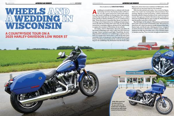 A wedding is a wonderful time to celebrate with friends and family, but when that family resides in Wisconsin, it is also a great excuse for a motorcycle adventure. My cousin’ s wedding was during Labor Day weekend, and the trip would take me through Milwaukee, so I called some friends at Harley- Davidson to see if I could borrow a bike. They offered me a beautiful Blue Burst Low Rider ST. Arriving on the Friday before the wedding and planning to return the bike the Tuesday after Labor Day, my trip quickly turned into a multiday odyssey, giving me the opportunity to explore the wonders of Wisconsin on two wheels.