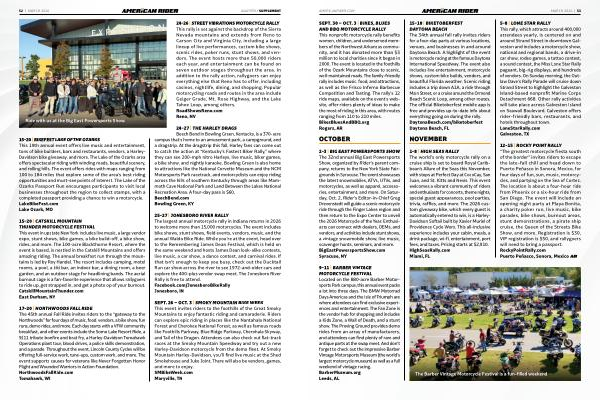 SEPT. 26 – OCT. 3 | SMOKY MOUNTAIN BIKE WEEK This event invites riders to the foothills of the Great Smoky Mountains to enjoy fantastic riding and camaraderie. Riders can explore epic riding in places like the Nantahala National Forest and Cherokee National Forest, as well as famous roads like Foothills Parkway, Blue Ridge Parkway, Cherohala Skyway, and Tail of the Dragon. Attendees can also check out flat- track races at the Smoky Mountain Speedway and try out a new Harley- Davidson motorcycle from the demo fleet. At Smoky Mountain Harley- Davidson, you’ ll find live music at the Shed Smokehouse and Juke Joint. There will also be vendors, games, and more to enjoy. SMBikeWeek. com Maryville, TN