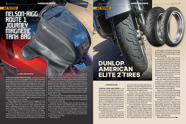 TOURING TIRES ARE ASKED to do quite a few things and last many miles. Recently, I had the opportunity to try a set of Dunlop American Elite 2 tires on my 2017 Harley- Davidson Road Glide Ultra. I had previously tested the first generation of these tires( see August 2022 issue of Rider or RiderMagazine. com), and over the course of three months and more than 2,000 miles I found the secondgeneration tires to be a considerable improvement over the already impressive original American Elites.