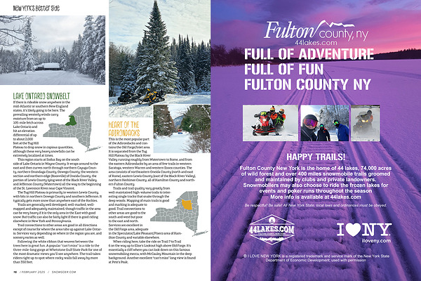 The Tug Hill Plateau is primarily in western Lewis County , with bits in northern Oswego County and southern Jefferson . It typically gets more snow than anywhere east of the Rockies . Trails are generally well developed , well-marked , wellmapped and adequately maintained , though traffic in the area can be very heavy if it is the only area in the East with good snow . But traffic can also be fairly light if there is good riding elsewhere in New York and Pennsylvania .