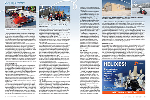 Trail 163 features traditional ditch riding , but we really enjoy this split trail – with northbound traffic on the east side of the road and southbound on the west side . You get occasional views of the famous walleye-infested lake , there ’ s a raised overlook on the lake to visit , and a couple more interesting snowmobiler- and fisherperson-friendly pitstops in case you have not yet had lunch – including Nitti ’ s Hunters Point Resort about half way up the lake and Castaways closer to Malmo .