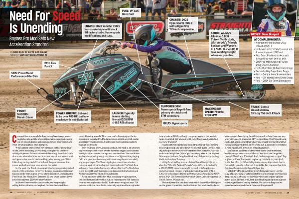 Baynes Motorsports has been at the top of the snowmobile drag racing and speed run worlds for quite a while , holding multiple records across different race surfaces , classes and race disciplines . What you ’ re seeing here is the Baynes Motorsports Grass Drag Pro Mod , one of the most winning sleds in the class ’ history .