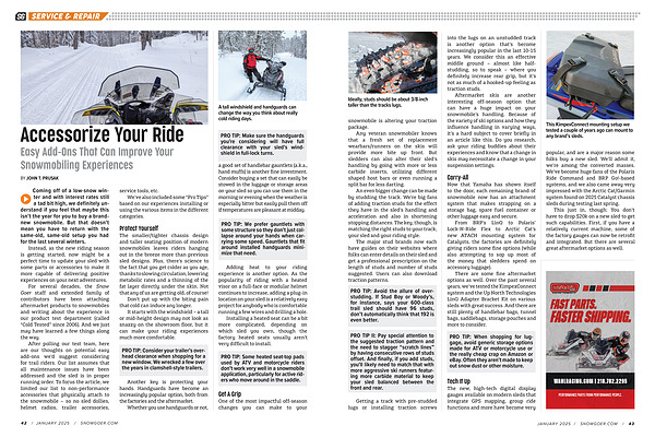 After polling our test team , here are our thoughts on potential easy add-ons we ’ d suggest considering for trail riders . Our list assumes that all maintenance issues have been addressed and the sled is in proper running order . To focus the article , we limited our list to non-performance accessories that physically attach to the snowmobile – so no sled dollies , helmet radios , trailer accessories , service tools , etc .