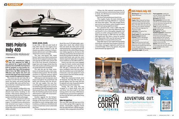 “Where the 340 required concentration always and maximum concentration if you wanted to ‘book,’ the 400 features a much less demanding feel,” they reported. Our Snow Goer predecessors loved it too. “The rougher it gets, the more twisting the trail, the better the Indy (400) likes it,” reported one Snow Goer editor. “The Indy simply allows you to drive much faster, under complete control than the leaf-spring rigid-front sleds.”