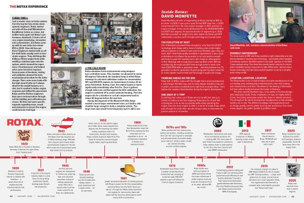 THE EVOLUTION OF SHOT One of Monfette’ s proudest Rotax innovations is the Start Hot( SHOT) technology, which began with a vision of starting a two-stroke engine without a battery or a starter. It took some time: Monfette says a few concepts didn’ t meet Rotax quality standards or expectations. It was a large undertaking to reconfigure the generator to not only produce enough electricity to power the machine, but to also charge an ultracapacitor to then discharge with enough juice to pass top dead center. Without reconfiguring, the engine wouldn’ t have enough power to reach more than 6,000 RPM while in generation mode – switching between true TQ generation vs electric generation. Beyond going past top dead center, the air in the cylinder must be fresh and full enough to spark a full charge.