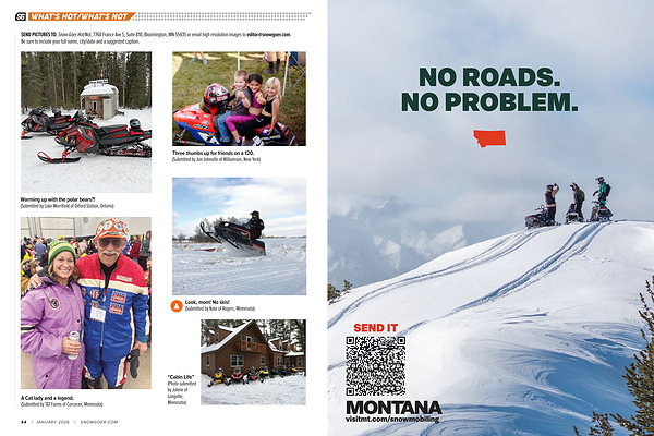 SEND PICTURES TO: Snow Goer Hot / Not, 7760 France Ave S, Suite 810, Bloomington, MN 55435 or email high resolution images to editor @ snowgoer. com. Be sure to include your full name, city / state and a suggested caption.