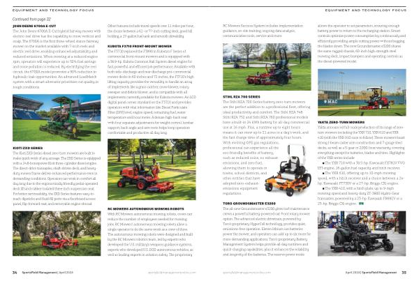 STIHL RZA 700 SERIES The Stihl RZA 700 Series battery zero-turn mowers are the perfect addition to a professional fleet , offering ideal productivity and comfort . The Stihl RZA 748 , Stihl RZA 752 and Stihl RZA 760 professional models have a built-in 24 kWh battery for all-day commercial use at 16 mph . Plus , a runtime up to eight hours means it can mow up to 21 acres in a day ’ s work , and the fast charge time of approximately four hours . With evolving OPE gas regulations , the professional can experience all the eco-friendly benefits of battery , such as reduced noise , no exhaust emissions , and zero fuel , allowing them to operate in towns , school districts , and other entities that have adopted zero-exhaustemissions equipment regulations .