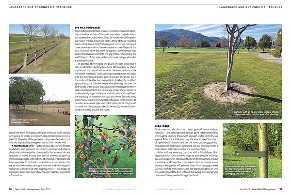 Canvas, rubber and linen stakes are especially good in that they will support the tree without damaging the bark. sportsfieldmanagementonline. com April 2025 | SportsField Management