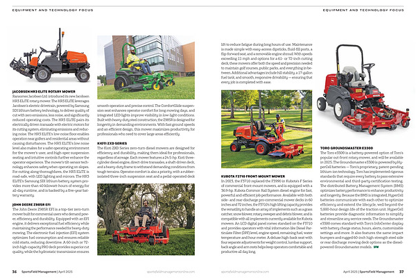 TORO GROUNDSMASTER E3300 The Toro e3300 is a battery-powered option of Toro’ s popular out-front rotary mower, and will be available in 2025. The Groundsmaster e3300 is powered by HyperCell batteries— Toro’ s proprietary, patent-pending lithium-ion technology. Toro has implemented rigorous standards that require every battery to pass extensive environmental and third-party certification testing. The distributed Battery Management System( BMS) optimizes battery performance to enhance productivity and longevity. Because the BMS is integrated, HyperCell batteries communicate with each other to optimize efficiency and extend the lifecycle, well beyond the 5,000-hour design life of the traction unit. HyperCell batteries provide diagnostic information to simplify and streamline any service needs. The Groundsmaster e3300 comes standard with Toro’ s InfoCenter display with battery charge status, hours, alerts, customizable settings and more. It also features the same impact bumpers and rugged 60-inch high-strength steel side or rear discharge mowing deck options as the dieselpowered Groundsmaster models. sportsfieldmanagementonline. com April 2025 | SportsField Management