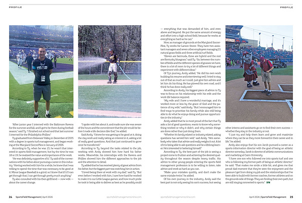 “ I have one son who followed me into sports turf and one who is following my former path of being an athletic director,” he said.“ That makes me smile a little bit, and gives me that proud dad moment that they ' ve seen the enjoyment and the pleasure I get from doing my job and the relationships that I ' ve been able to build with former coaches, former athletes and on the grounds side of things. They are finding their own path, but are still staying connected to sports.” sportsfieldmanagementonline. com April 2026 | SportsField Management