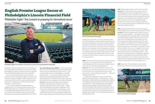 SFM : Speaking of the World Cup , how does hosting the Premier League Summer Series help you prepare for 2026 ? Leonard : I think the biggest thing in 2026 is how our fields are going to expand — the length and the width . Unfortunately , that ’ s something that ’ s not easily done in any NFL stadium without removing some rows of seats , but it ’ s something we are gearing up for . The technology and techniques are always evolving . We were in Qatar in November for the World Cup , and we learned quite a bit from those folks and seeing how they do things ; then we can add our little spin to it . We all work together ; this is not a competition to see who can have the best field . One thing is for certain , FIFA wants all of the venues to have the best field — they want them all to be great . That collaborative approach between us and FIFA is how we achieve that . To do these international soccer matches and bring in the English Premier League , get their feedback to see what works and what doesn ’ t work , will be great for us .
