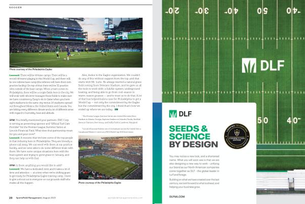 SFM : You briefly mentioned your partners . FMC Corp is serving as presenting sponsor and “ Official Turf Care Provider ” for the Premier League Summer Series at Lincoln Financial Field . What does that partnership mean for you and your crew ? Leonard : It ensures that we have some of the top people in that industry here in Philadelphia . They are literally a phone call away . We can work with them at our practice facility , and we were able to do some different trials with them . We have some unique situations here with the heat system and trying to grow grass in January , and they can help us with that .